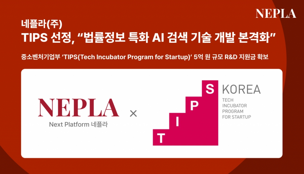리걸테크 스타트업 네플라(대표 최주선)가 중소벤처기업부의 'TIPS(팁스)' 프로그램에 선정돼 5억원 규모의 연구·개발(R&D) 지원금을 확보했다고 28일 밝혔다.