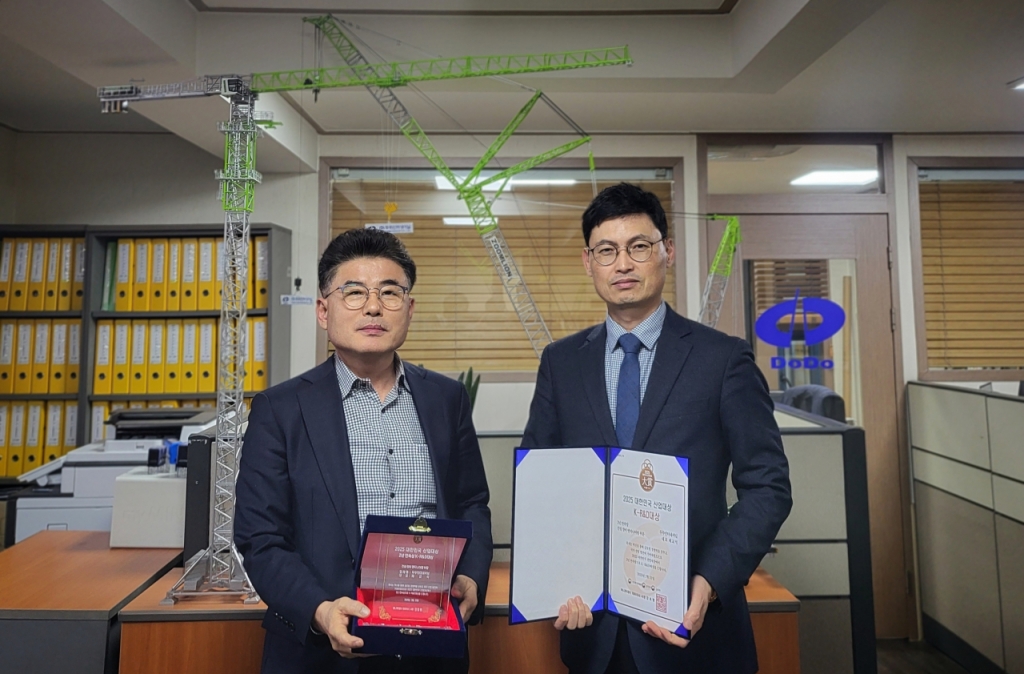 채교석 두두인터내셔널 대표(사진 왼쪽)와 동사 강희선 상무가 머니투데이 주최의 '2025 제11회 대한민국 산업대상'에서 건설 장비 엔지니어링 부문으로 'K-R&D대상 2년 연속상'을 비대면 수상한 뒤 기념 촬영 중이다.