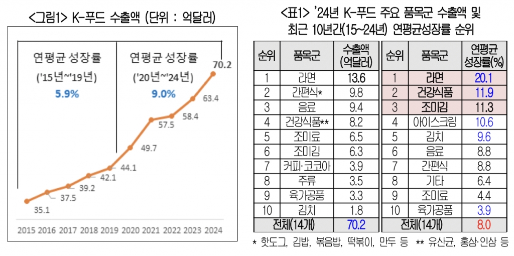 또 지난 10년간 K-푸드 수출의 연평균 성장률은 8.0%로 나타났다. 특히 2015~2019년 성장률은 5.9%, 2020~2024년 성장률은 9.0%로 최근 5년간 수출이 크게 늘었다.