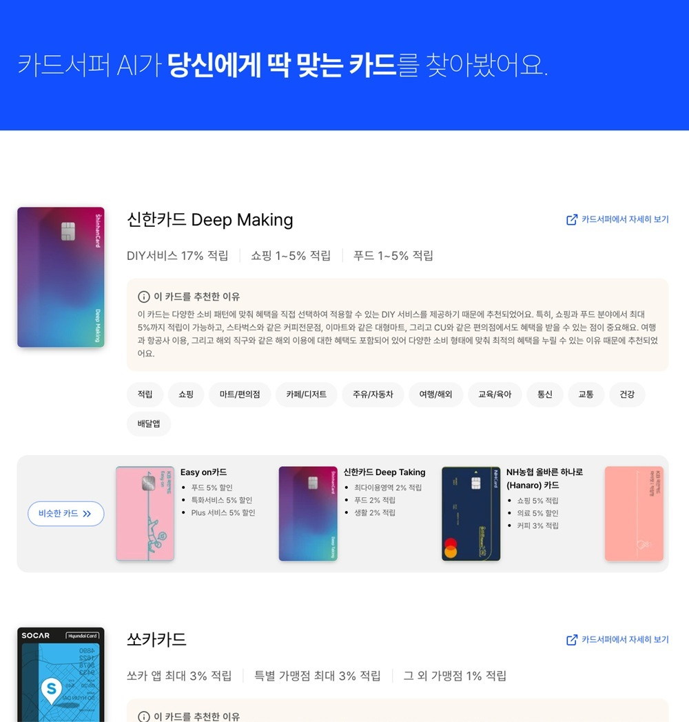 카드서퍼는 △AI를 기반으로 맞춤형 카드를 추천하는 'AI 카드 추천' △조건별 카드를 검색하는 '카드 찾기' △카드 발급 프로모션 제공 플랫폼별 캐시백 금액을 모아 보여주는 '캐시백 모아보기' △카드 상품 설명을 요약해 제공하는 'AI 상품 요약' △최대 3개 카드를 비교하는 'AI 상품 비교' △예상 혜택 금액과 혜택률을 계산하는 '카드 혜택 계산기' 등의 기능을 갖춘 서비스다.