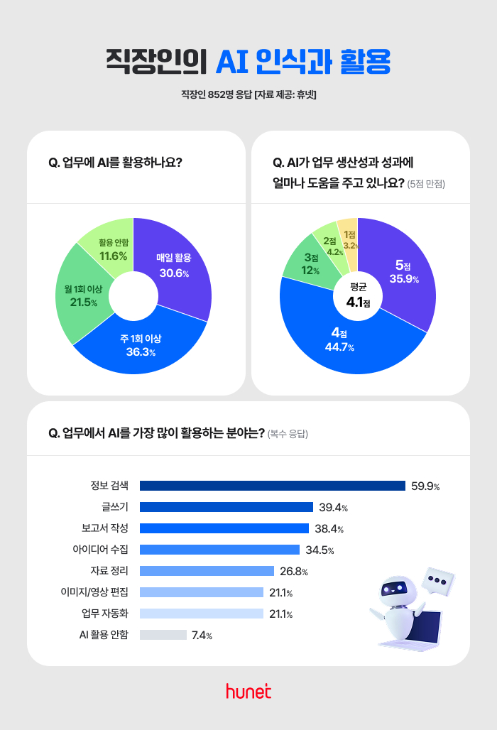 기업교육 전문기업 휴넷(대표 조영탁)은 '직장인의 AI 인식과 활용'에 대한 설문조사 결과를 발표했다. 본 설문에는 직장인 852명이 응답했다.
