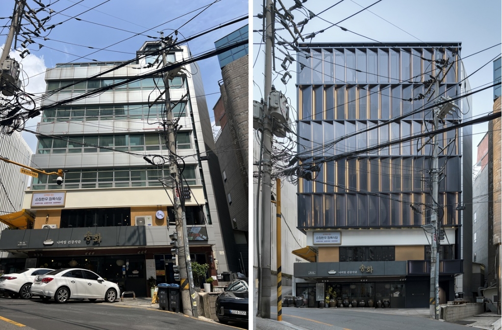 리모델링 범위는 건물 전체로, 기존 임차인이 있는 지하 1층과 지상 1층을 제외한 외부와 내부 공용부(화장실·계단·로비) 및 주차장 등이 포함됐다. 특히 5층은 기존 건축주가 살던 주택이었는데 용도 변경을 통해 오피스로 바꿨다.