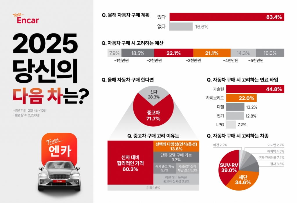 이번 설문조사는 올해 소비자들의 자동차 구매 계획과 구매 시 고려 요소를 알아보기 위해 지난 2월 4일부터 10일까지 총 2280명을 대상으로 진행됐다.