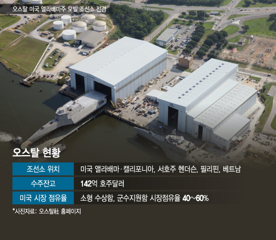 미국은 연안무역법(Jones Act)을 통해 자국에서 건조된 선박으로만 미국 연안 운송을 하도록 규정하고 있다. 상선은 물론 군함에도 이 법이 적용된다. 미국과 상호방위조약을 체결한 인도태평양 지역 국가에 있는 조선소에 군함 건조를 맡길 수 있도록 한 법안이 발의된 상태지만 통과는 미지수다. 한 업계 관계자는 "미국에 조선소가 있는데다 군함 건조 실적도 풍부한 오스탈을 인수해 법적 변수와 무관하게 현지 군함시장 공략을 추진하려는 것"이라고 말했다.