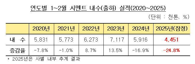 24일 한국시멘트협회에 따르면 지난 1~2월 시멘트 출하량은 445만톤으로 잠정 집계됐다. 이는 전년 동기 대비 24.8% 감소한 규모다. 최근 5년 내 같은 기간 판매량 중 가장 낮은 수치이기도 하다. 2023년 약 712만톤을 정점으로 2년 만에 37.5% 줄었다.