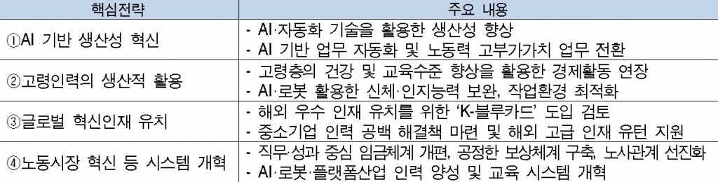 저출생·고령화로 인한 노동력 감소에 대응하고 연금·재정 등 사회 시스템을 유지하기 위해 인공지능(AI) 기반 생산성 혁신과 고령 인력 활용, 글로벌 인재 유치 등을 통한 성장 전략이 필요하다는 분석이 제기됐다.