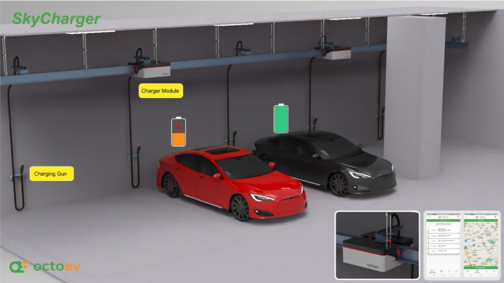 옥토브의 핵심 기술은 주차장 천장이나 벽에 설치된 레일을 따라 충전기가 자동으로 이동하며 전기차를 충전하는 솔루션이다.
