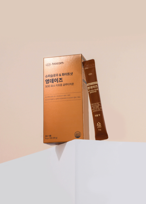 에스오디(SOD: superoxide dismutase)는 항산화효소로 활성산소를 소거하는 체내 생성 물질이다. 30대를 기점으로 SOD 체내 생성량은 급격하게 줄어드는 반면, 활성산소는 일상 속 우리가 호흡하고 에너지를 얻는 모든 과정에서 끊임없이 생성된다. 바이오컴 '슈퍼슬로우&화이트샷 영데이즈 SOD 효소 리포좀 글루타치온'은 바로 이 점에 착안해 기획된 SOD 항산화효소와 항산화물질을 복합적으로 설계한 제품이다.