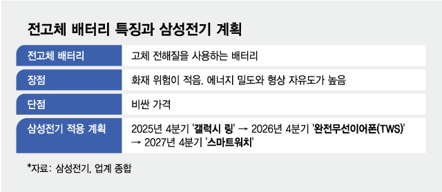 1일 업계에 따르면 삼성전기는 올해 4분기 갤럭시 링을 시작으로 2026년 4분기 완전무선이어폰(TWS), 2027년 4분기 스마트워치에 전고체 배터리 시제품을 각각 적용한다는 목표를 세웠다.