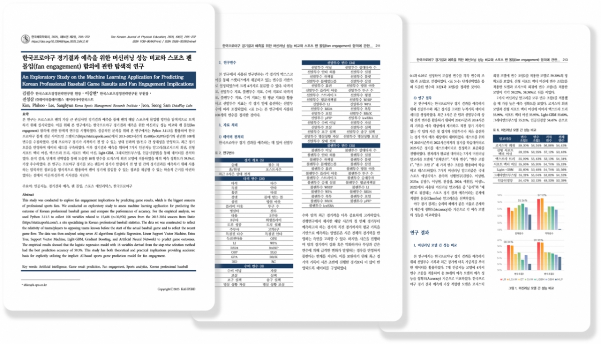 한국스포츠경영전략연구원(김필수 원장)이 최근 한국체육학회지 제64권 2호에 '한국프로야구 경기결과 예측을 위한 머신러닝 성능 비교와 스포츠 팬 몰입(fan engagement) 함의에 관한 탐색적 연구' 논문을 게재했다고 8일 밝혔다.