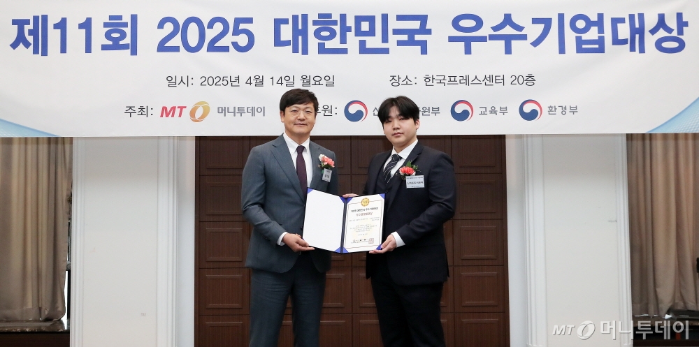 서영찬 스위프트서포터 대표(사진 오른쪽)가 14일 오후 서울 중구 한국프레스센터에서 열린 머니투데이 주최의 '2025 제11회 대한민국 우수기업대상' 시상식에서 '동대문 의류 풀필먼트 플랫폼' 부문 '우수플랫폼대상'을 수상하고 송기용 머니투데이 전무와 기념사진을 찍고 있다.