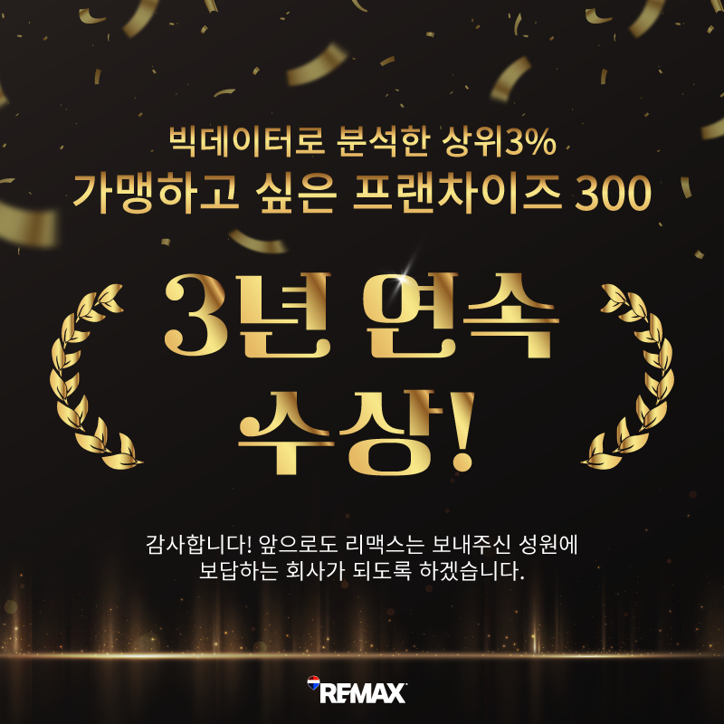 글로벌 부동산 프랜차이즈 브랜드 리맥스코리아(대표 신희성)가 최근 '가맹하고 싶은 프랜차이즈 300'에 3년 연속 선정됐다고 17일 밝혔다.