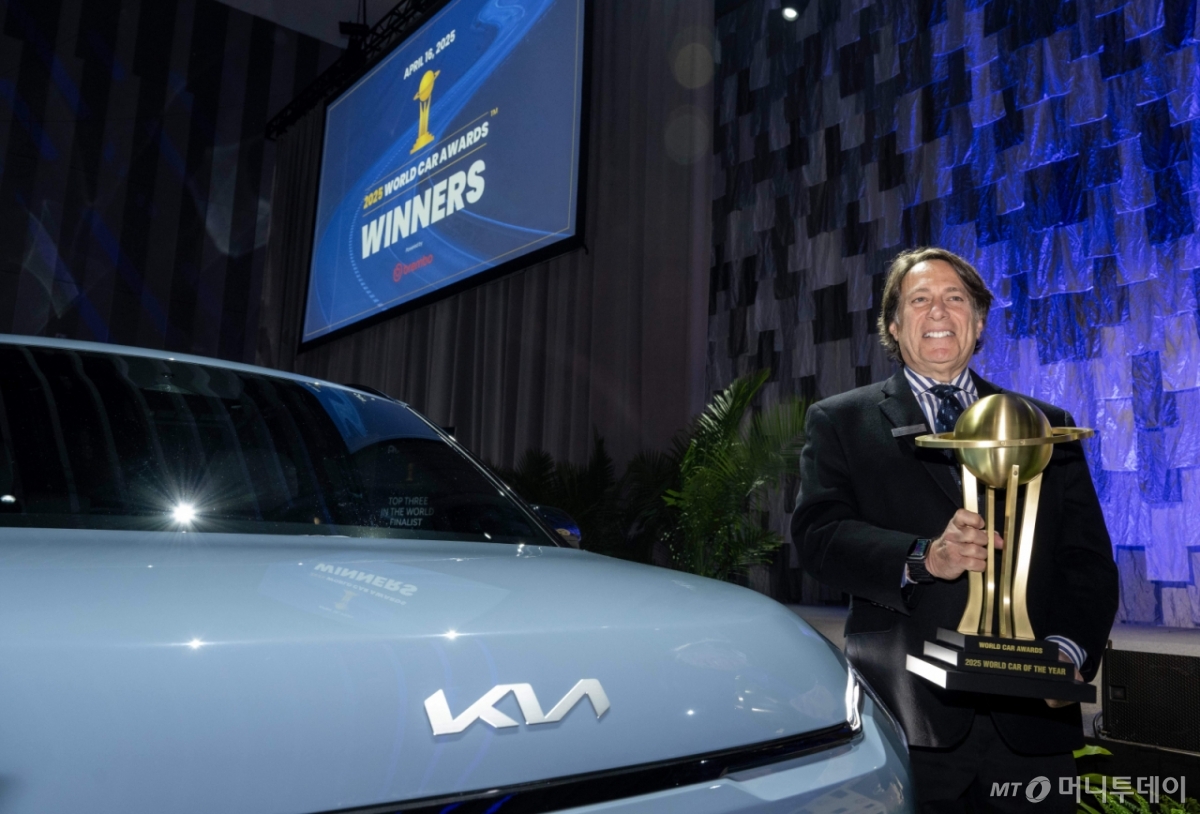 ![[서울=뉴시스] 기아는 세계 최고 권위의 자동차 상인 ‘2025 월드카 어워즈(2025 World Car Awards)’에서 EV3가 ‘세계 올해의 자동차(World Car of the Year, WCOTY)’에 선정됐다고 20일 밝혔다. 사진은 스티븐 센터 기아 미국법인 최고운영책임자(COO)가 세계 올해의 차 수상 기념사진을 촬영하는 모습. (사진=현대차·기아 커뮤니케이션 센터 제공) 2025.04.20. photo@newsis.com *재판매 및 DB 금지 /사진=](https://thumb.mt.co.kr/cdn-cgi/image/f=avif/21/2025/04/2025042010515950915_2.jpg)