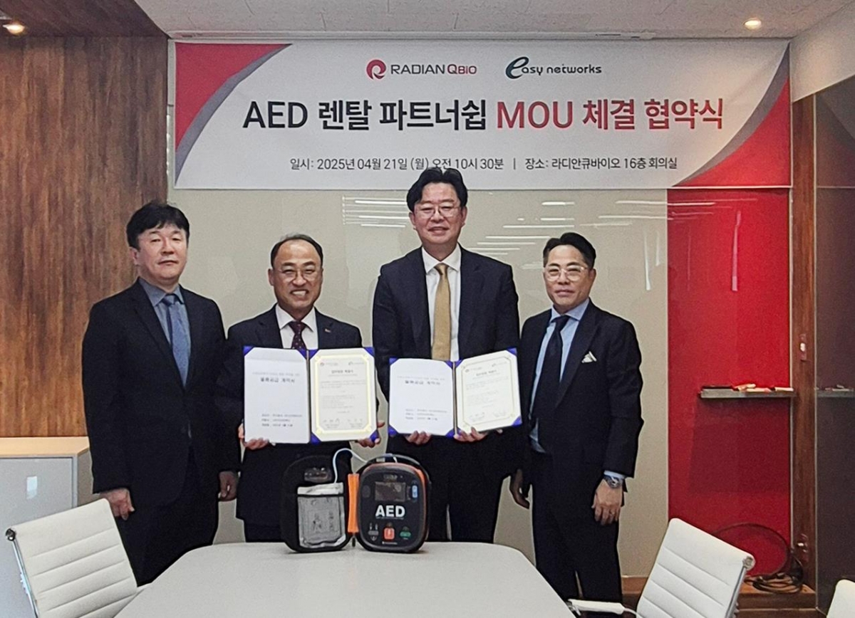 바이오헬스케어 전문기업 라디안큐바이오(대표 이제우)는 21일 서울시 구로구에서 전문적인 종합렌탈 서비스를 제공하는 이지네트웍스(대표 박관병)와 '렌탈 기반 자동심장충격기(AED) 렌탈서비스 사업화를 위한 업무협약'을 체결했다고 밝혔다.