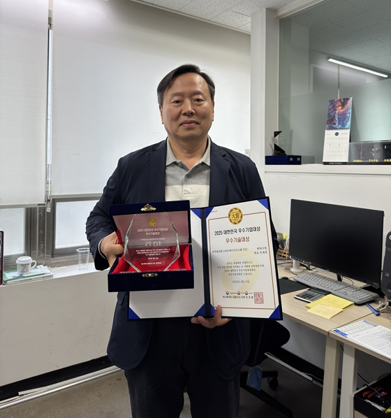 문재희 엠테크윌 대표가 머니투데이 주최의 '2025 제11회 대한민국 우수기업대상'에서 '지역냉난방 스마트에너지시스템' 부문 '우수기술대상'을 비대면 수상하고 기념사진을 촬영 중이다.