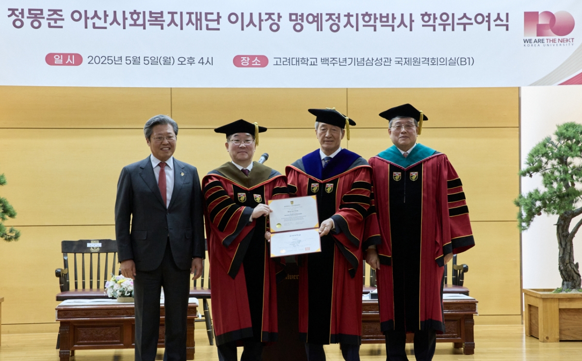 고려대는 정 이사장이 7선 국회의원으로서 정치 발전과 외교·안보 강화에 헌신하고, 아산사회복지재단과 아산나눔재단을 통해 사회 복지 증진, 미래세대 육성에 기여한 공로를 인정해 명예정치학박사학위를 수여했다.