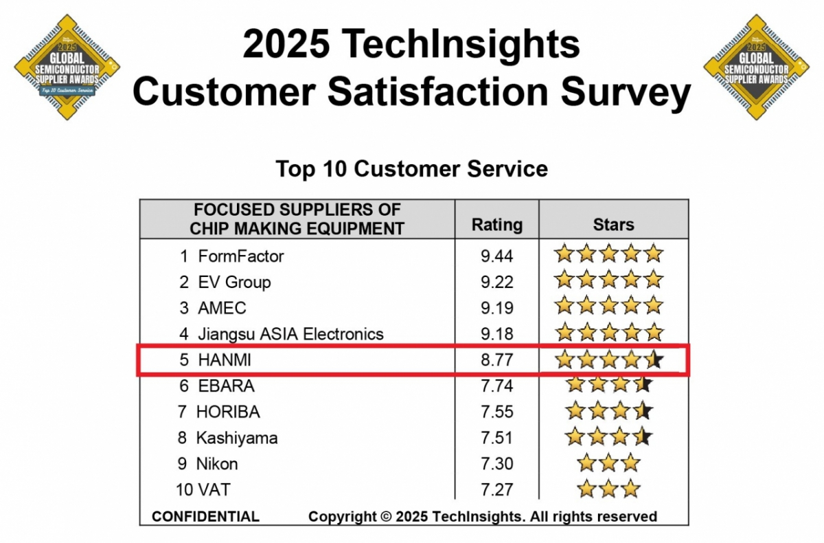 한미반도체는 글로벌 반도체 전문 조사 기관 '테크인사이츠'가 주관하는 '2025년 테크인사이츠 고객만족도 조사'에서 국내 반도체 장비기업 중 유일하게 '세계 10대 베스트 반도체 장비기업'에 이름을 올렸다고 15일 밝혔다.