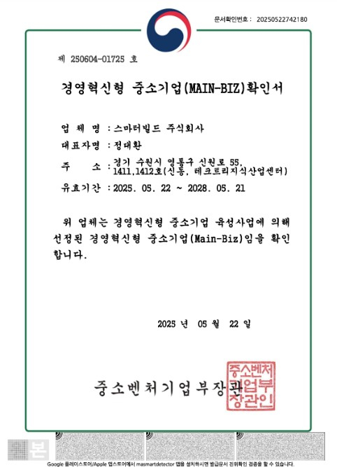 스마터빌드(대표 정대환)가 최근 중소벤처기업부로부터 경영혁신형 중소기업 '메인비즈(Main-Biz)' 인증을 취득했다고 28일 밝혔다.