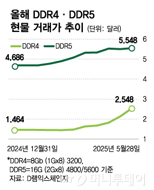 DDR4의 가격 상승은 최신 제품인 DDR5의 상승률을 훌쩍 넘는다. DDR4 가격이 약 40% 오르는 사이 DDR5(16G·2Gx8) 현물가는 제자리(0.4% 상승)이다. 지난 3~4월 오름세를 보였던 DDR5는 최근 상승 동력이 떨어진 모습이다. 일부에서는 고점을 찍었다는 평가도 나온다.