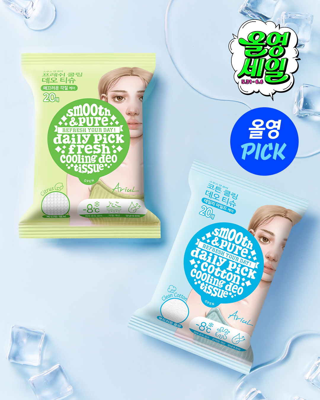 '올영픽(P!ck)'은 매달 올리브영이 선정한 이달의 브랜드 제품을 할인된 가격으로 선보이는 프로모션으로, 이번 '올영픽' 행사에 '아리얼 스무스 앤 퓨어 쿨링 데오티슈' 2종이 선정되어 올리브영 단독 1+1 기획 상품을 할인된 가격에 만나볼 수 있다.