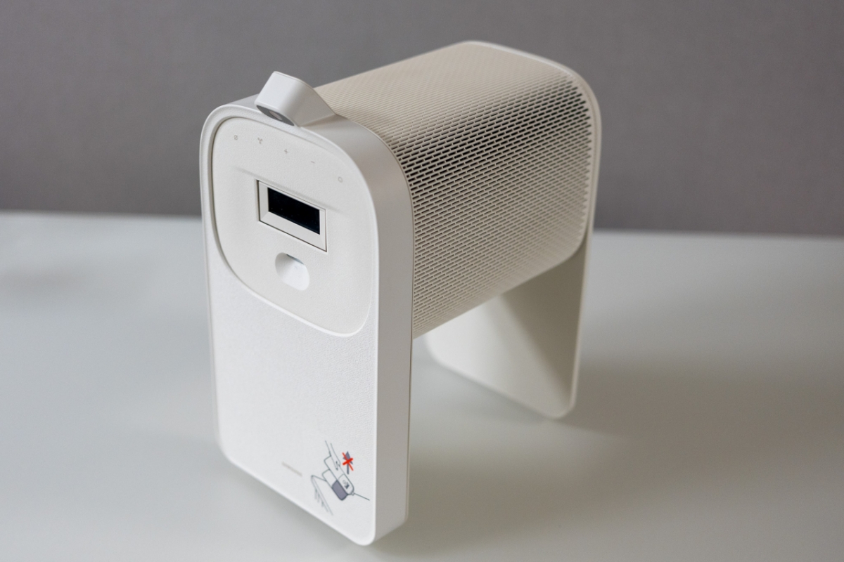 본체 상단부에는 거리 감지 센서와 프로젝터 렌즈가 있고, 전원·음량·멀티기능·마이크 버튼이 있어 기본적인 조작이 가능하다. 태양광으로 충전되는 '솔라셀 리모컨'을 활용하면 좀 더 쉽게 기기를 쓸 수 있다.
