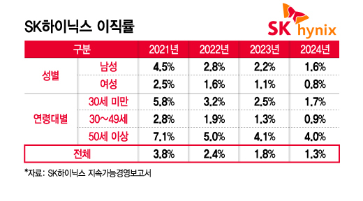지난해 이직률을 연령대별로 구분해 살펴보면 50세 이상(4.0%) 대비 30~49세(0.9%)와 30세 미만(1.7%)의 이직률이 상대적으로 낮았다. SK하이닉스의 전체 직원(2024년 기준 4만100명) 중 약 70%가 30~49세(2만8400명)인데 이들의 이직률이 최저였다. 성별로 구분하면 여성(0.8%)의 이직률이 남성(1.6%)의 절반 수준이었다.