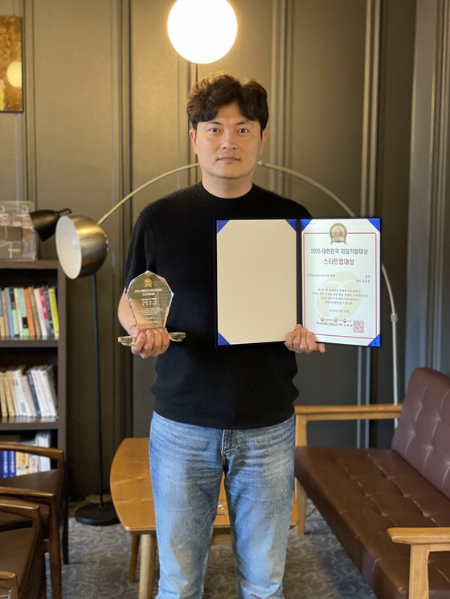 조규성 블릭 대표가 머니투데이 주최의 '2025 제11회 대한민국 리딩기업대상'에서 'Embodied AI 구현' 부문 '스타트업대상'을 비대면 수상하고 기념사진을 촬영 중이다.