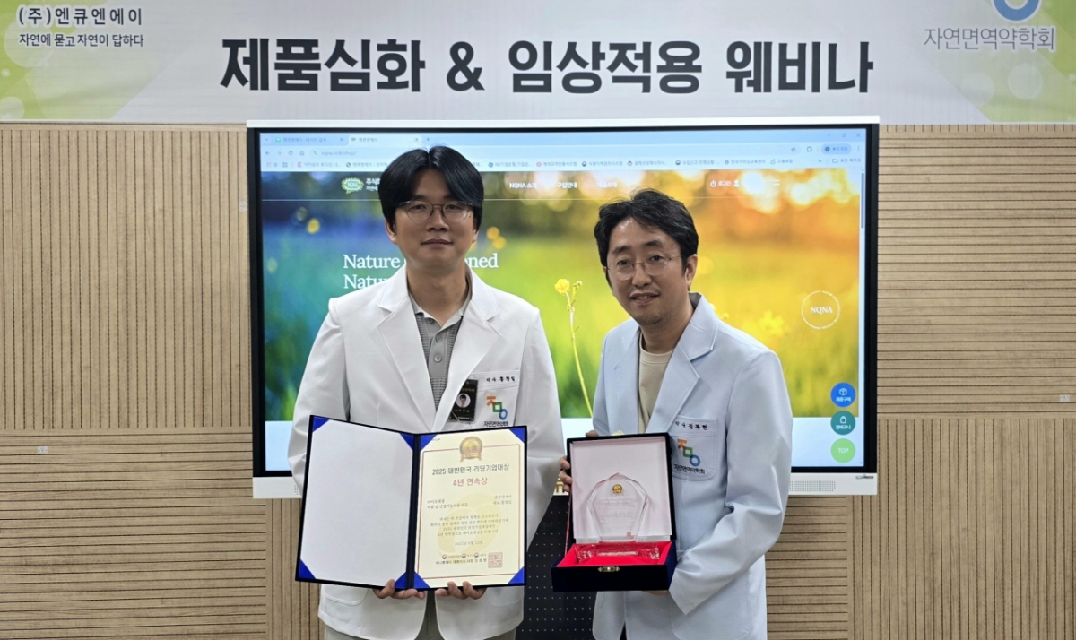 홍창일 엔큐엔에이 대표(사진 왼쪽)와 동사 이후엽 상무가 '2025 제11회 대한민국 리딩기업대상'에서 4년 연속상으로 식품 및 건강기능식품 부문 바이오대상을 비대면 수상한 뒤 기념 촬영 중이다.