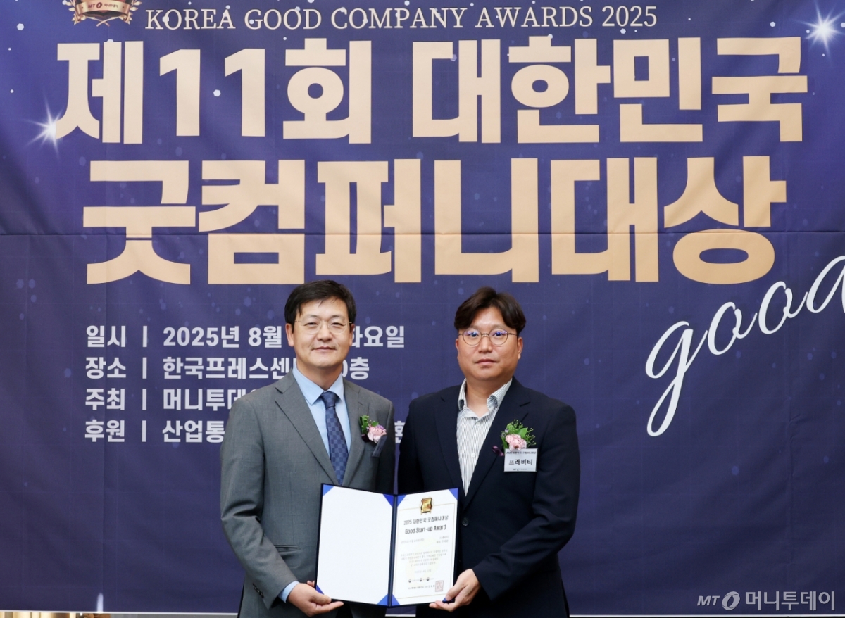주세환 프래비티 대표(사진 오른쪽)가 12일 오후 서울 중구 한국프레스센터에서 열린 머니투데이 주최의 '2025 제11회 대한민국 굿컴퍼니대상' 시상식에서 '층간소음 저감 솔루션' 부문 'Good Start-up Award'(굿-스타트업대상)를 수상하고 송기용 머니투데이 전무와 기념사진을 촬영 중이다.