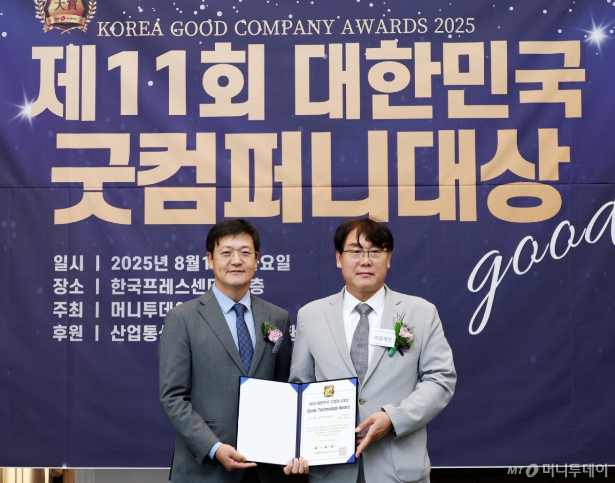 박대영 리얼게인 대표(사진 오른쪽)가 12일 오후 서울 중구 한국프레스센터에서 열린 머니투데이 주최의 '2025 제11회 대한민국 굿컴퍼니대상' 시상식에서 '발전소 제어·계측 장비 개발' 부문 'Good-Technology Award'(굿-기술대상)를 수상하고 송기용 머니투데이 전무와 기념사진을 촬영 중이다.