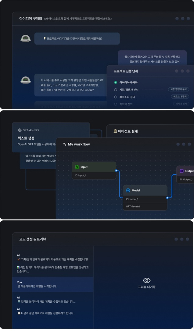 '스튜디오'는 만들고 싶은 AI 서비스를 텍스트로 입력하면 아이디어를 구체화할 수 있다. AI 에이전트와 함께 기획서를 자동 완성하는 것도 가능하다. 기획 다음 설계 단계에서는 AI 기능 API를 설계한다. 이후 구현 단계에서는 바이브코딩으로 AI 서비스를 구현한다. 비전문가도 AI 서비스 기획부터 설계, 구현까지 한 번에 해결할 수 있다고 회사 측은 말했다.