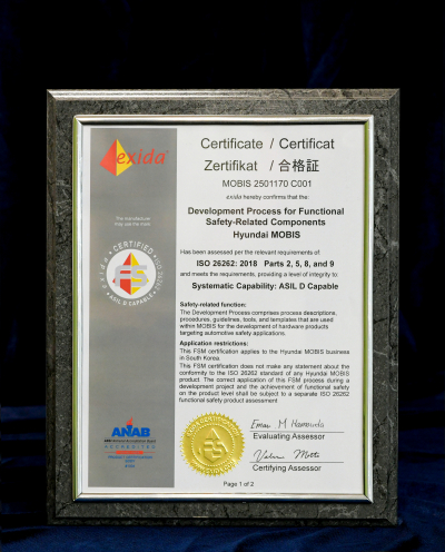 현대모비스는 ISO 26262 인증을 위한 차량 안전 무결성 기준(ASIL)에서 가장 높은 D등급을 받았다. ASIL은 A부터 D까지 총 4단계로 나뉘는데 D등급은 99% 이상 엄격한 신뢰도로 안전사고를 예방할 수 있다는 것을 의미한다.