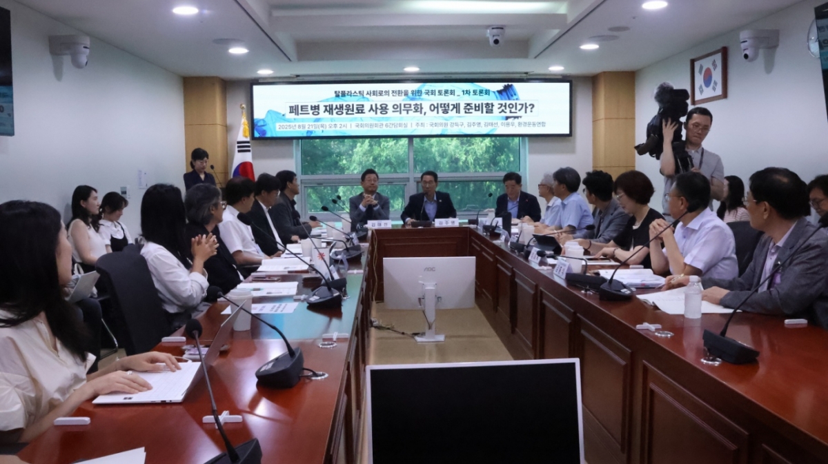21일 서울 여의도 국회의원회관에서는 '탈플라스틱 사회 전환을 위한 토론회'가 열렸다. 토론회에는 강득구·김주영 더불어민주당 의원과 한국화학산업협회 등 유관 기관 관계자들이 참석했다. 이번 논의는 내년부터 물·음료 페트병에 재생 원료를 10% 이상 사용해야 하는 제도가 시행됨에 따라 업계 의견을 듣기 위해 마련됐다. 의무 사용 비율은 2030년까지 30%로 확대될 예정이다.