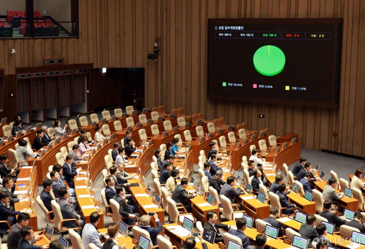 ![[서울=뉴시스] 김금보 기자 = 25일 오전 서울 여의도 국회에서 열린 제428회국회(임시회) 2차 본회의에서 상법 일부개정법률안이 더불어민주당 주도로 통과되고 있다. 2025.08.25. kgb@newsis.com /사진=김금보](https://thumb.mt.co.kr/cdn-cgi/image/f=avif/21/2025/08/2025082510244415796_1.jpg)
