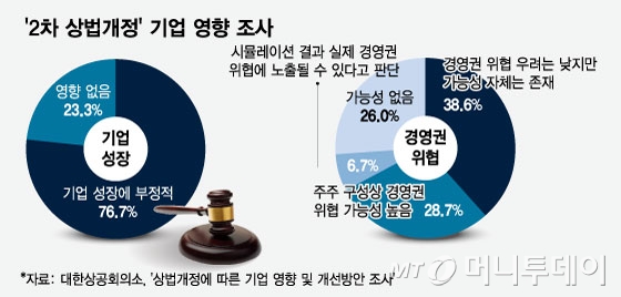 이번 개정으로 자산 2조 원 이상 상장사는 집중투표제를 의무화(정관 배제 불가)하고 감사위원 분리선출을 기존 1명에서 2명 이상으로 확대해야 한다. 지난달 대한상공회의소가 300개 상장기업 대상으로 실시한 '상법개정에 따른 기업 영향 조사' 결과, 상장기업 76.7%는 2차 상법 개정안이 기업의 성장에 부정적 영향을 줄 수 있다고 답했다. 74%는 경영권 위협 가능성을 지적했다.