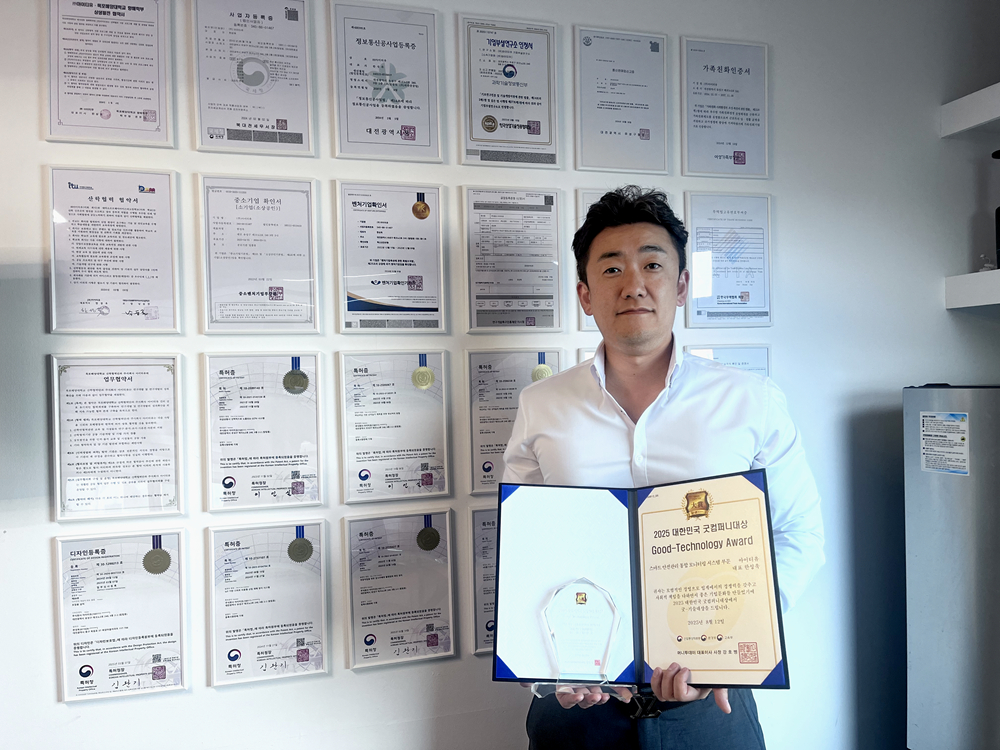 한성욱 아이티유 대표가 머니투데이 주최의 '2025 제11회 대한민국 굿컴퍼니대상'에서 '스마트 안전관리 통합 모니터링 시스템' 부문 'Good-Technology Award'(굿-기술대상)를 비대면 수상하고 기념사진을 촬영 중이다.