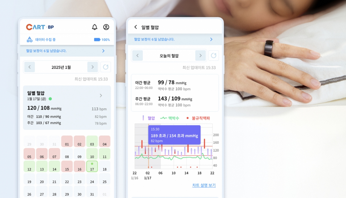 '카트 비피(CART BP)'는 손가락에 착용하는 반지형 혈압계로, 사용자는 착용만으로 수면을 포함한 일상 전반에서 혈압을 측정할 수 있다. 이 제품은 식품의약품안전처로부터 의료기기로 인증을 획득했다. 이 기기는 이미 임상적 유효성이 입증되어 병원에서 건강보험 적용을 받아 처방·사용 중인 '카트 비피 프로(CART BP pro)'의 기술을 기반으로 개발됐다.