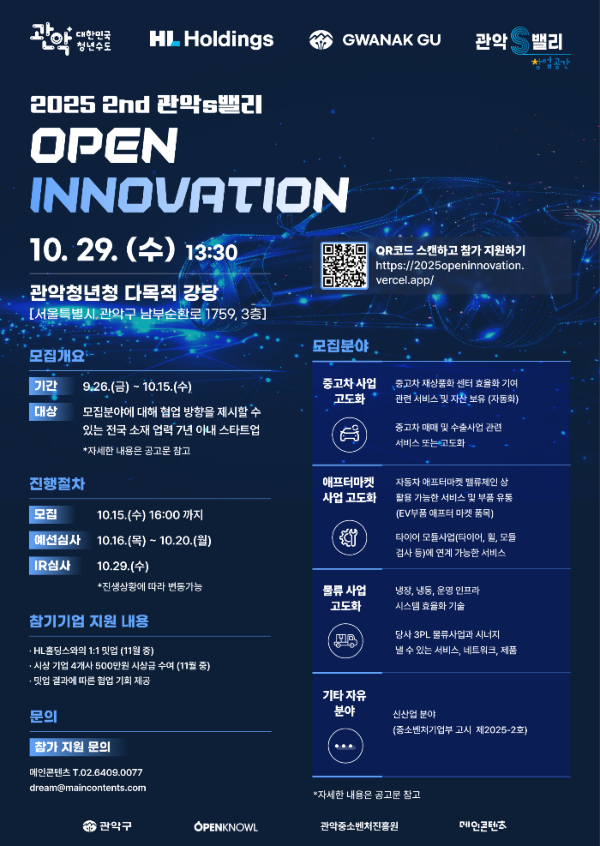 관악구와 HL홀딩스가 함께하는 '2025 제2회 관악S밸리 오픈 이노베이션'이 유망 스타트업을 찾기 위한 참가기업 모집을 본격 시작했다. 모집 기간은 9월 26일부터 10월 15일까지이며, 최종 선발된 기업들은 오는 10월 29일(수) 관악청년청 다목적 강당에서 열리는 본 행사 무대에 오른다.
