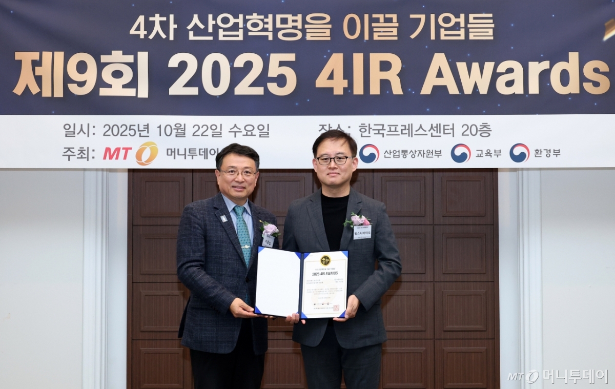 이중철 윙스타바이오 대표(사진 오른쪽)가 22일 오후 서울 중구 한국프레스센터에서 열린 머니투데이 주최의 '2025 제9회 4IR 어워즈(4th Industrial Revolution Awards)'에서 '알츠하이머성 치매 치료제'로 '바이오헬스 부문 대상'을 받고 이종섭 동국대학교 교수와 기념 촬영 중이다.
