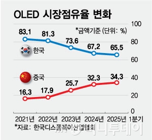 이같은 지원을 등에 업고 이미 LCD(액정표시장치) 시장을 장악한 중국 기업은 한국 기업이 이끄는 OLED 시장에서 영향력을 키우고 있다. 2021년 16.3%였던 중국 기업의 OLED 점유율은 올해 1분기 34.3%로 늘었다. 같은 기간 한국 기업은 83.1%에서 65.5%로 줄었다. 2026년 OLED 시장 규모는 600억달러(86조원)에 이를 것으로 전망된다.