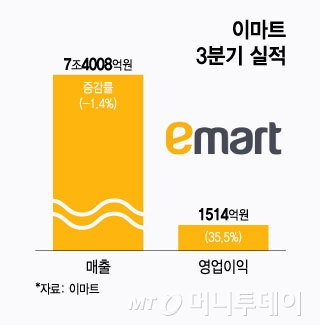 이마트는 올해 3분기 연결기준 순매출이 7조4008억원으로 전년 동기 대비 1.4% 감소했다고 11일 잠정공시했다. 영업이익은 1514억원으로 지난해보다 397억원(35.5%) 증가했다. 2분기 흑자전환에 이어 2분기 연속 개선흐름을 보였다. 올 1~3분기 누적 영업이익 역시 전년 동기 1242억원 대비 167.6% 늘어난 3324억원을 기록하며 견고한 실적 성장세를 나타냈다.