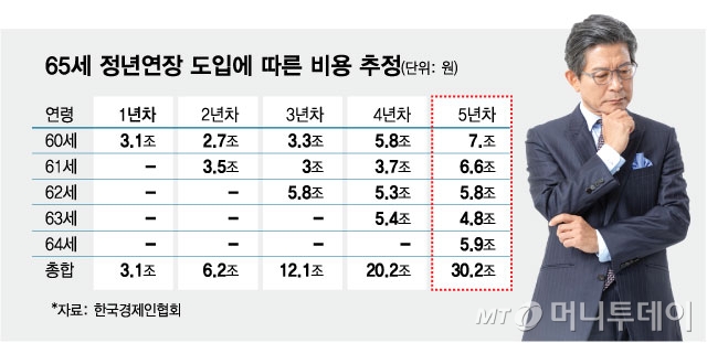 재계는 높은 임금 연공성, 경직성을 그대로 둔 상태에서 일률적으로 고령자 고용부담만 지우면 개별 기업의 인건비 부담과 더불어 복지지출 확대에 따른 사회적 비용도 만만치 않게 커질 것으로 예상했다. 한국경제인협회가 지난해 조사한 바에 따르면 법정 정년이 65세로 연장될 경우 60~64세 정규직 근로자(59만명) 고용에 따른 비용(임금 및 4대 보험료)이 연간 30조2000억원에 달할 전망이다. 이는 25~29세 청년층 90만2000명을 근로자로 고용할 수 있는 수준이다. 아울러 한국노동연구원은 연공형 임금체계가 유지될 경우 앞으로 개별 세대가 부담할 사회적 비용이 2023년 기준 GDP(국내총생산) 대비 7%, 노동부문만 고려하면 약 110조원에 달할 것으로 분석했다.