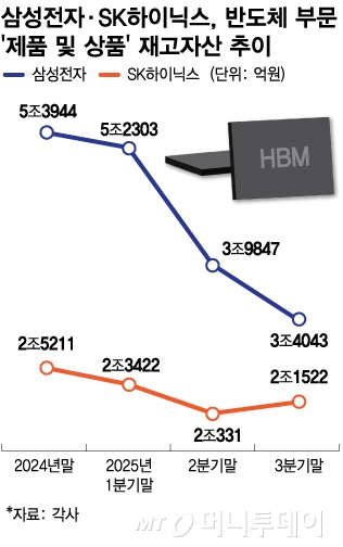 SK하이닉스 역시 올해 재고가 줄고 있다. 올해 3분기 '제품 및 상품' 재고자산은 2조1522억원으로 지난해 말과 비교해 3689억원 감소했다. SK하이닉스는 지난 3분기 실적발표에서 "메모리 수요 강세로 D램과 낸드 모두 전 분기 대비 재고가 감소했다"며 "특히 D램은 재고가 지극히 낮은 수준으로 DDR5(더블데이터레이트5)는 고객 수요에 대응하기 위해서는 생산된 제품이 고객에게 즉시 출하되는 상황"이라고 설명했다.