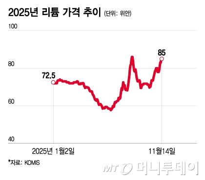 17일 한국자원정보서비스(KOMIS)에 따르면 지난 13일 기준 리튬 가격은 1㎏ 당 85.0위안에 거래됐다. 전기차 배터리 수요 둔화와 중국의 저가·과잉 공급의 영향으로 지속 하락하던 리튬 가격은 연중 50위안대까지 떨어졌으나 올 하반기 반등에 성공했다. 중국의 비철금속 공급 조절 기조, AI(인공지능) 데이터센터 폭증에 따른 ESS(에너지저장장치) 수요 확대 기대감 등이 작용한 결과다.
