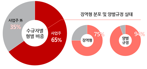 특히 채용절차법·남녀고용평등법·고령자고용법·기간제법·근로자참여법·중대재해처벌법은 오로지 사업주(사용자)만을 형벌 수규자로 하고 있어 '사업주 편향적 형사책임 구조'가 고착화돼 있다는 분석이다. 또 전체 357개 형벌조항 중 징역형을 규정한 조항은 268개(75%)에 달했다. 징역형은 최후의 수단이어야 함에도 이를 과도하게 일반적 제재 수단으로 활용함으로써 '처벌 중심의 규제'가 일반화됐다는 지적이다.
