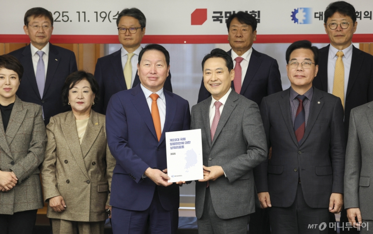 끝으로 최 회장은 "당 차원에서 상법 보완 장치를 마련하고 AI(인공지능)와 첨단 산업 지원, 상속세 관련 방안 등을 추진할 계획으로 아는데 잘 처리될 수 있도록 적극적인 지원을 부탁드린다"고 말했다.
