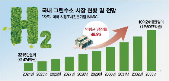 시장조사업체 IMARC는 2024년 한국의 그린 수소 시장 규모를 3215만달러(약 474억원)로 추산하고 2033년에는 10억2410만달러(1조5097억원) 이상으로 확대될 것으로 내다봤다. 연평균 성장률은 46.9% 수준으로 추산된다. 재생에너지 기반 수전해로 생산되는 그린 수소는 저탄소 수소의 핵심 축으로 향후 에너지 전환 속도가 빨라질수록 성장세도 가속화될 전망이다.