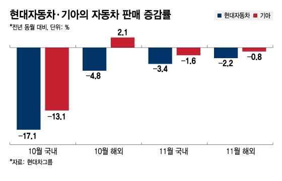 2일 업계에 따르면 10월에 이어 11월에도 국내 완성차 업체의 내수 판매 감소가 두드러졌다.