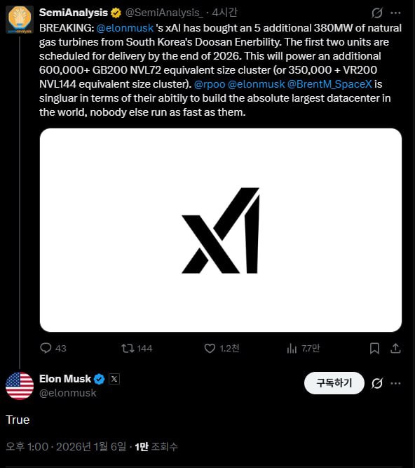 미국 시장조사업체 세미애널리시스(SemiAnalysis)는 5일(현지시간) X를 통해 "일론 머스크의 xAI는 한국의 두산에너빌리티로부터 380MW(메가와트) 천연가스 터빈 5대를 구매했다"며 "첫 두 대는 2026년 말까지 인도될 예정"이라고 설명했다. 머스크는 자신의 X에 이 내용을 공유하며 "사실이다(True)"라고 확인했다.