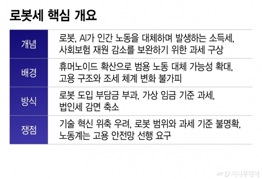 로봇세는 로봇 자체에 세금을 매긴다기보다는 로봇 사용으로 노동자 고용이 줄면서 발생할 수 있는 세수, 사회보험 재원·분배 등을 보완하기 위한 해결책으로 볼 수 있다.